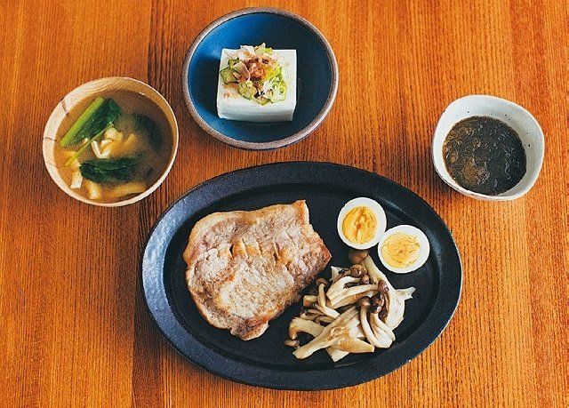・豚ステーキ/きのこソテー/ゆで卵/冷ややっこ/みそ汁/もずく酢