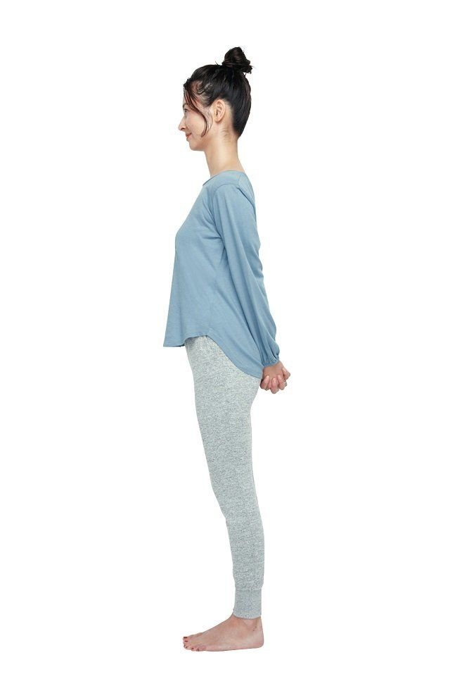 足を自分に合った自然な幅に開き、胸の前で手のひらを合わせます。