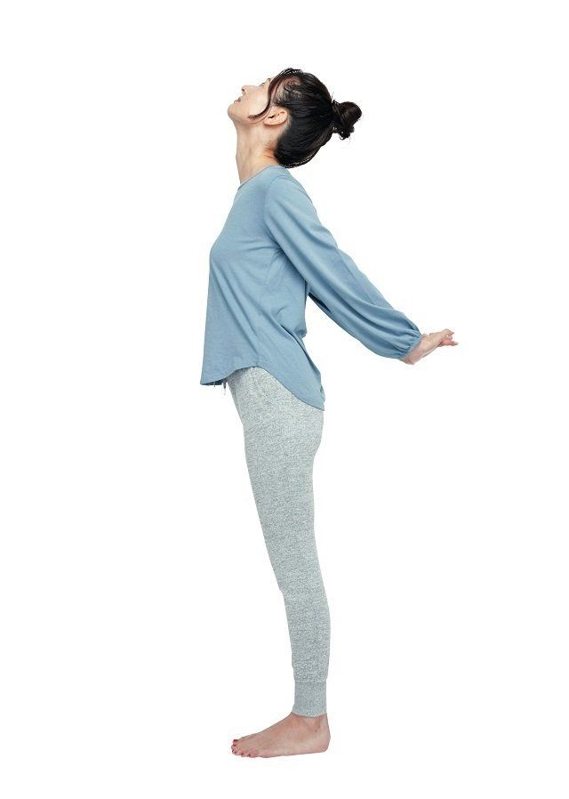 そのまま手のひらを返して、手を後ろにグーッと伸ばし、顔を上げて背中を伸ばして15秒キープ。しっかり胸を張って伸ばすのがコツ。