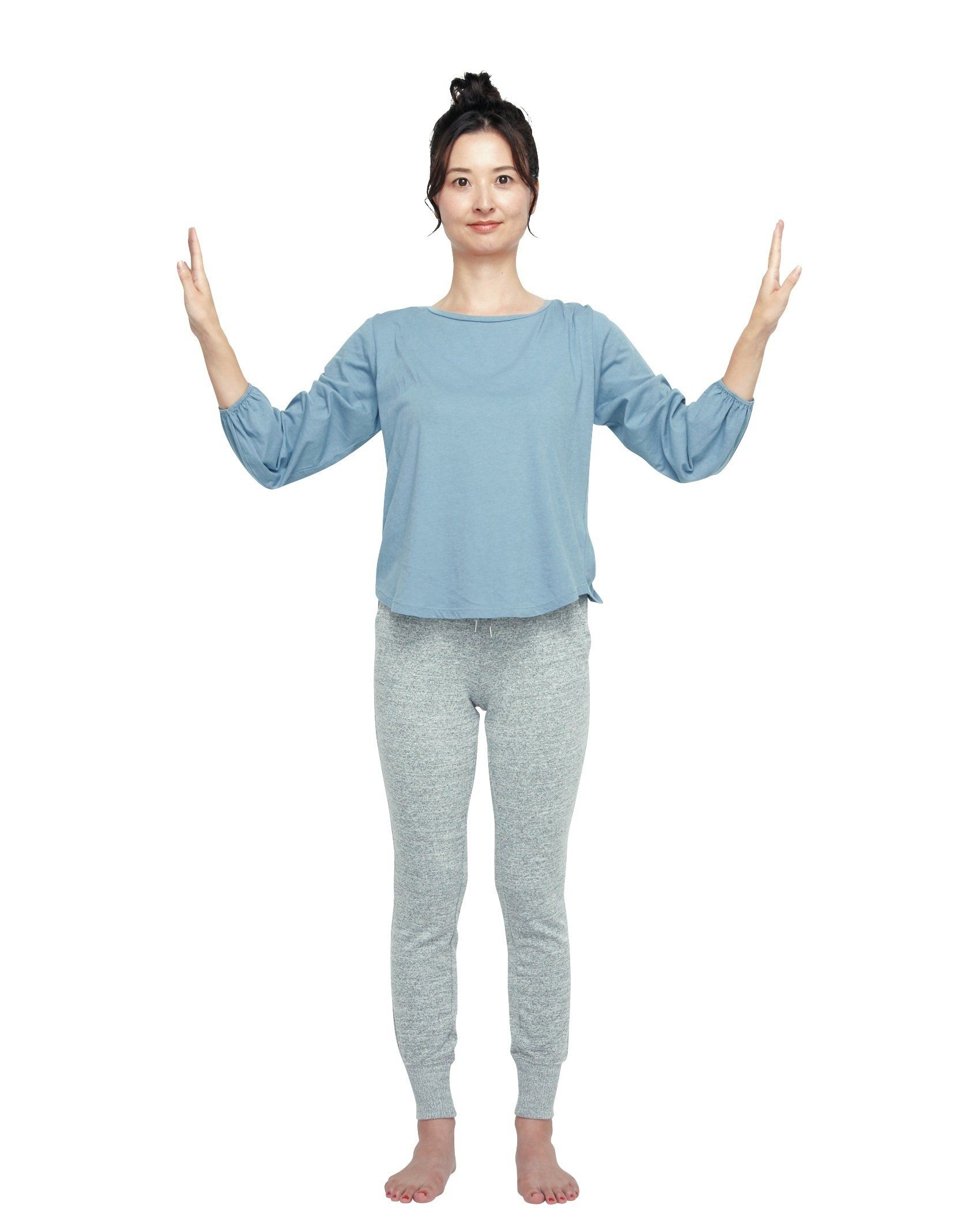 腕を頭の上に真っすぐに伸ばしたまま、左右の手のひらを返して、手の甲を合わせます。