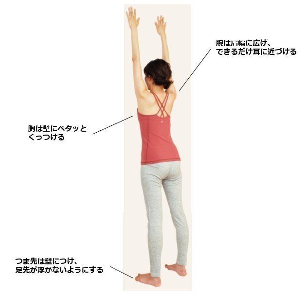 足を肩幅に開いて壁に向かって立ち、両腕を真っすぐ上に伸ばす。手のひら、胸、つま先を壁につける。足元が浮かないようにする。