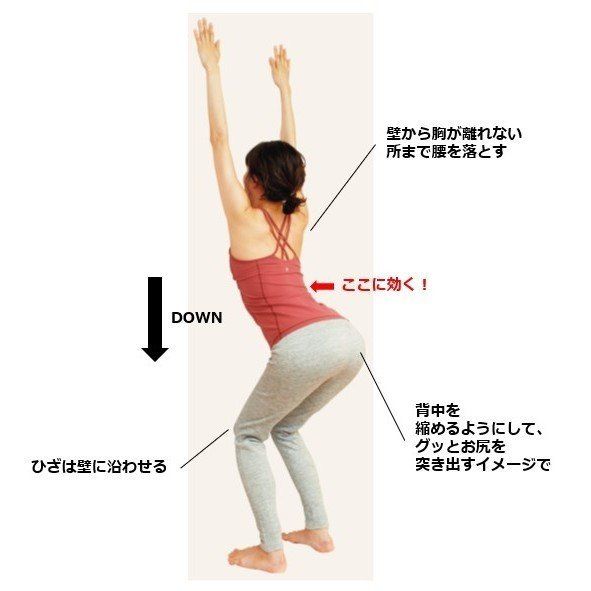 手のひら、胸を壁につけたまま、息を吐きながら、壁から胸が離れないところまで、ゆっくり腰を落とす。背中を縮めるようにして、グッとお尻を突き出すイメージで。限界まで下げたら、息を吸いながらゆっくり元の姿勢に戻す。