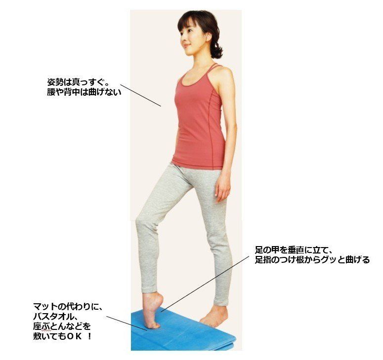 姿勢を正した状態で立ち、床に敷いたマットやバスタオルなどの上に、片方の足の指を曲げて立てる。足の甲を垂直に立て、足指のつけ根からグッと曲げる。マットの代わりに、バスタオル、座ぶとんなどを敷いてもOK。