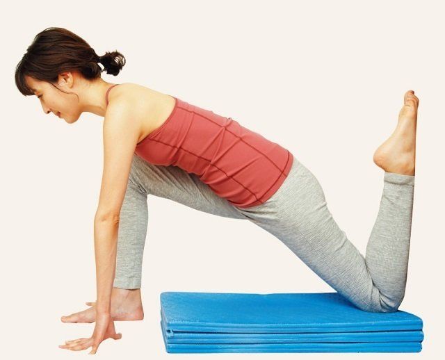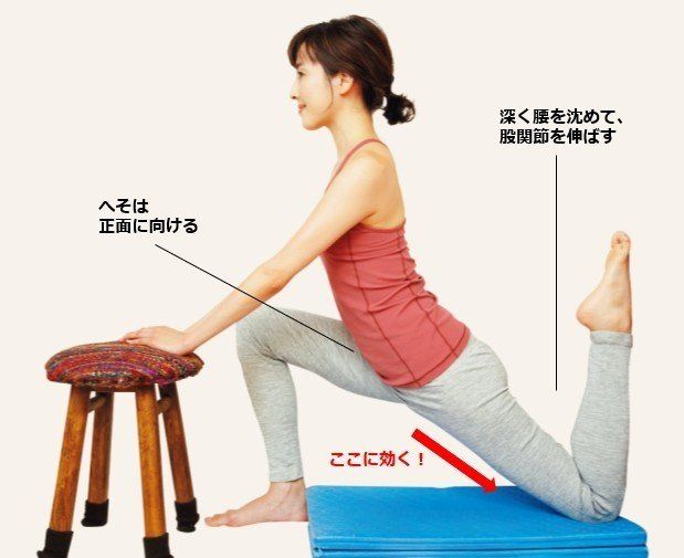 低めのいすを壁から90㎝ほど話して置く。四つんばいになって、片方のすねをマットに立てて、壁につける。