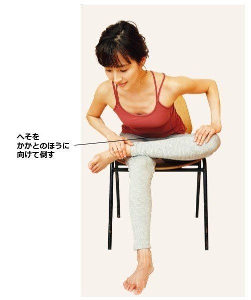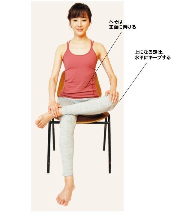 いすに腰かけ、片方の足をひざにのせる。反対側の手を上になっている足のかかとに添え、もう片方をひざ上に置く。