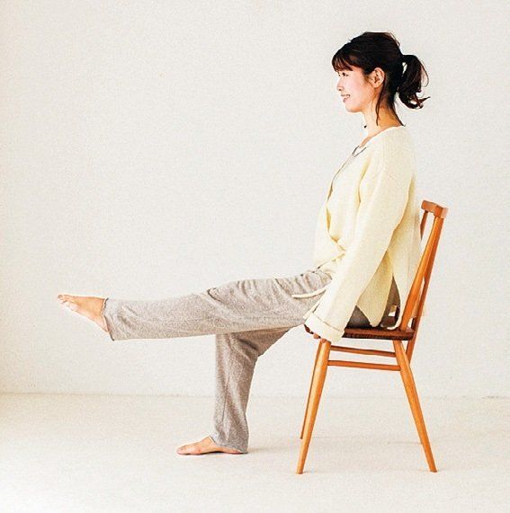 「筋肉は体内で最大の熱を生み出す組織なので、筋力アップは冷え改善に必須。きつい運動は必要なく、座ってやる足上げで充分。イスに座り、足を真っすぐ前に伸ばす下ろすを左右10回行って」