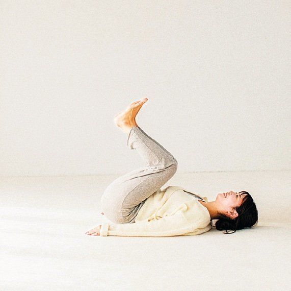 「おなかに筋肉がないと、脂肪が厚くなって老け体形に。これを防ぐためには、寝たまま腹筋を強化すること。あおむけになり両ひざをそろえて胸のほうに引き寄せます。10回×1~3セット行って」