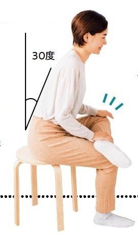 「お尻の筋肉が硬くなると、形くずれの原因に。ほぐすだけでも効果大」。イスに座り、左足を右足にのせ、右手を左足首に置く。左手で左ひざを押しながら、上体を30度前に倒して30秒キープ。左右とも行う。