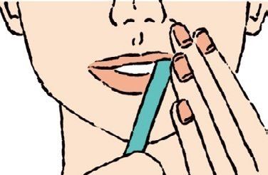 1カ所ずつ歯ブラシの柄のお尻部分を歯ぐきと頬の境目に入れて頬の内側にあてがう。息を吐きながら3秒間、頬側(外側)に向かって軽く押し、パッと離す。空いている手は顔の表面から柄のほうに当て、頬をはさむようにする。