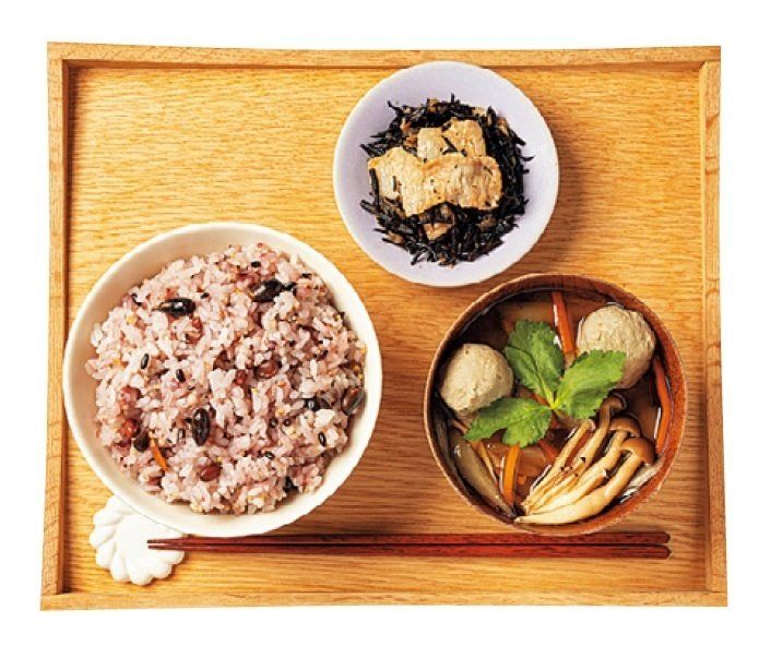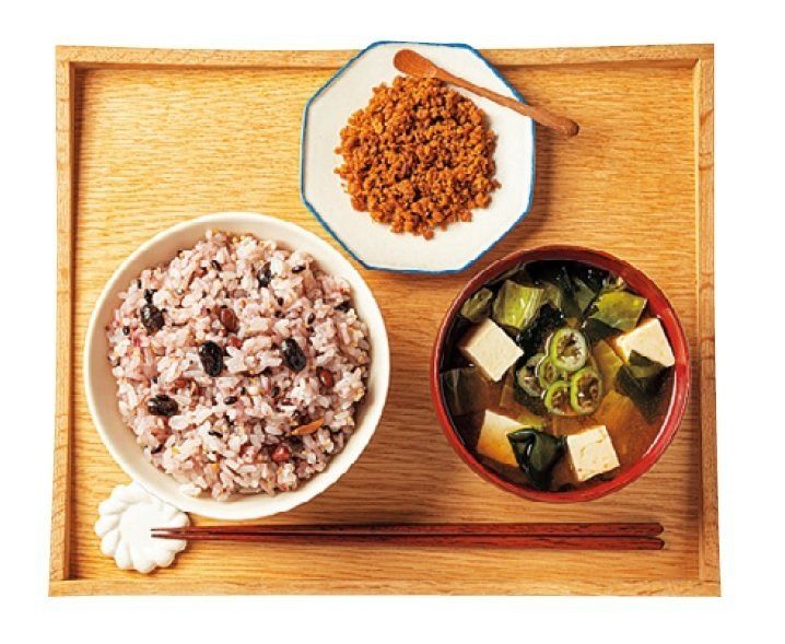 雑穀ご飯(150~300g)、具だくさんみそ汁、ご飯のお供。メインのおかずは、基本的にお休みし、つくだ煮や漬物などで軽めに。
