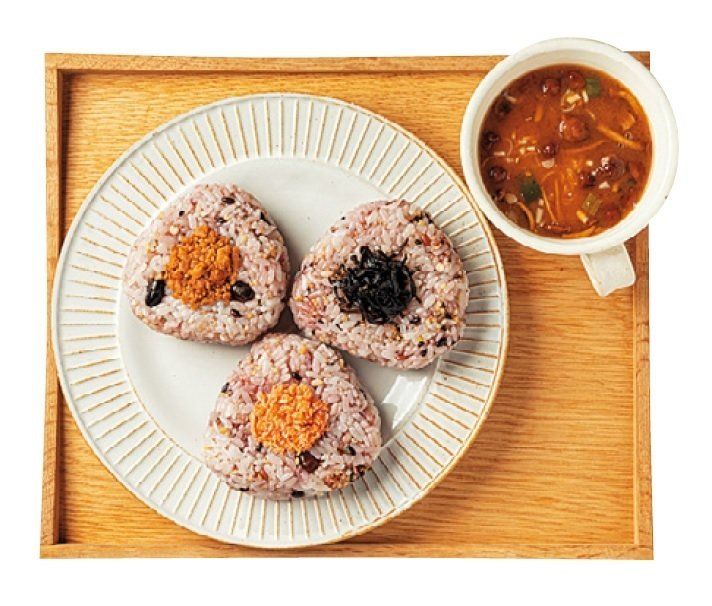 雑穀ご飯のおにぎり3個(1個100g)と、みそ汁(インスタントでも可)。おにぎりの具は、鮭フレークやそぼろなどのたんぱく質、塩昆布などの海草類でバランスよく。