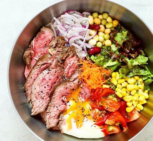 フライパンでつくったローストビーフを、コーン・トマト・玉ねぎ・ポーチドエッグなどと盛りつけたサラダボウル。牛肉をぜいたくに200gも使っているので、ボリューム満点!目でも楽しめて、おなかもしっかり満たされそうなメニューです。
