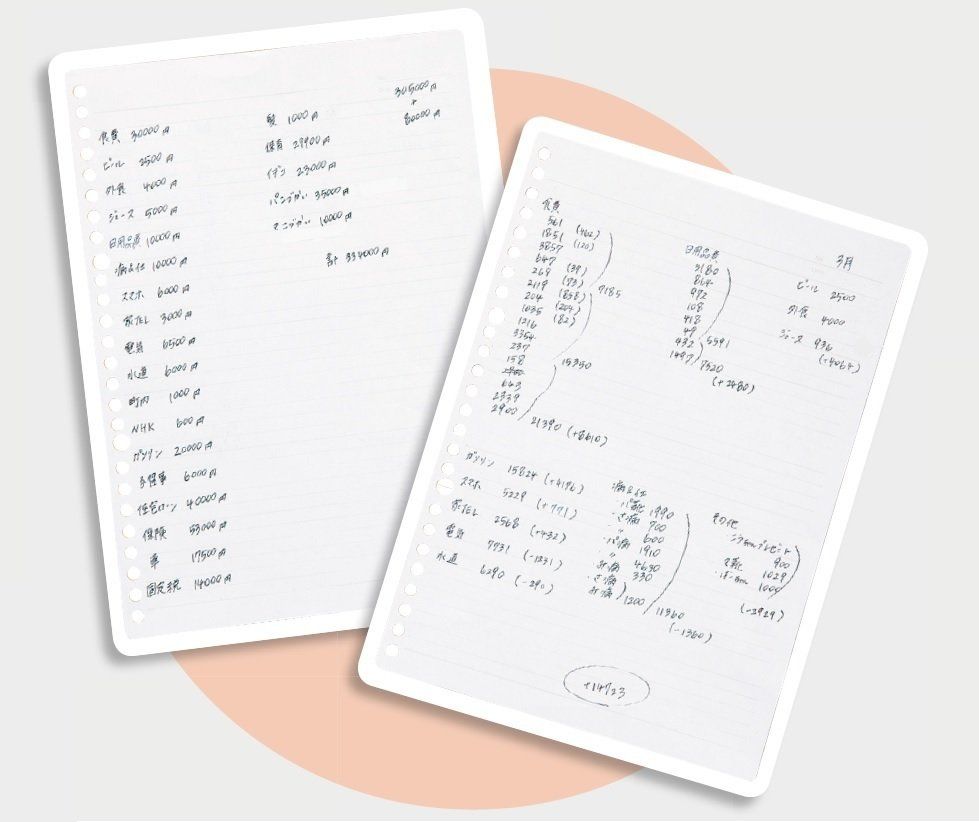 費目を細かく分けているので、日々の記録は使った金額だけ。「日付や店名も書かないからすぐ書き終わります。予算とも見比べやすく、どこを使いすぎたかも一目瞭然。夫と月1で家計を共有できるようになりました」。