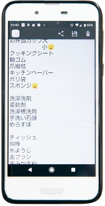 スマホのメモに、家中の日用品をすべてリストアップして保存。「キッチン系、子ども系、お風呂系など、場所ごとに区切っておくと、買い物前に効率よく在庫をチェックできて便利です♪」。