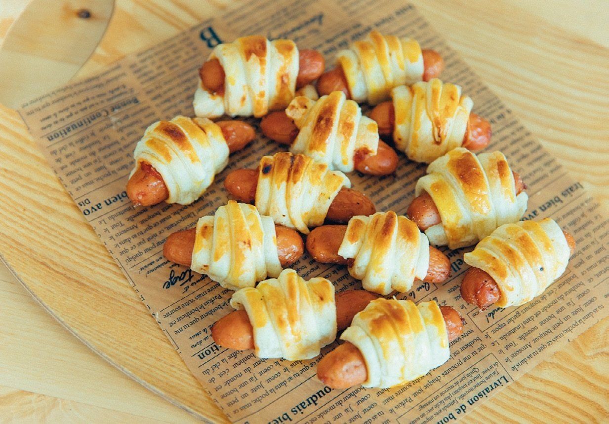 冷凍パイ生地を細く切ってウインナーに巻き、卵黄を塗ったらオーブントースターで20分焼く。