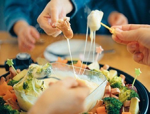 シュレッドチーズ1袋、牛乳100ml、片栗粉小さじ2をラップなしで3分レンチン。ゆでた野菜と一緒にホットプレートに並べる。