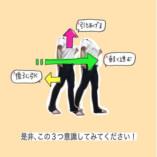 1つ目は、おなかや肋骨を持ち上げるように上半身を引き上げること。2つ目は、脚を前に出すよりも後ろに引くこと。3つ目は、むだな力を入れずにスーッと軽く進むこと。ぜひ意識して歩いてみてくださいね。