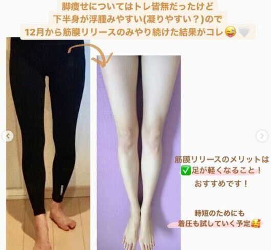 スラッとしたまっすぐきれいな脚を目指して、脚痩せチャレンジにも取り組んでいます。具体的に行っているのが、骨盤まわりのストレッチ、お風呂上がりのマッサージ、週に2~3回の脚パカトレーニング・筋膜リリースなど。また、時短のために着圧グッズを取り入れることも考えているそうです。