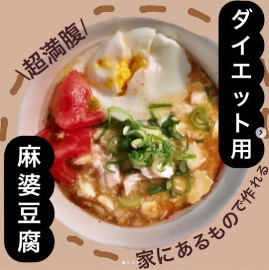 夜ごはんによく食べているメニューのひとつが、マーボー豆腐風丼。たっぷりの豆腐・ささみ・トマト・温泉卵・ネギなどの具材がたっぷり入った、ヘルシーで満足度の高い一品です。プチアレンジとして納豆を加えても◎。
