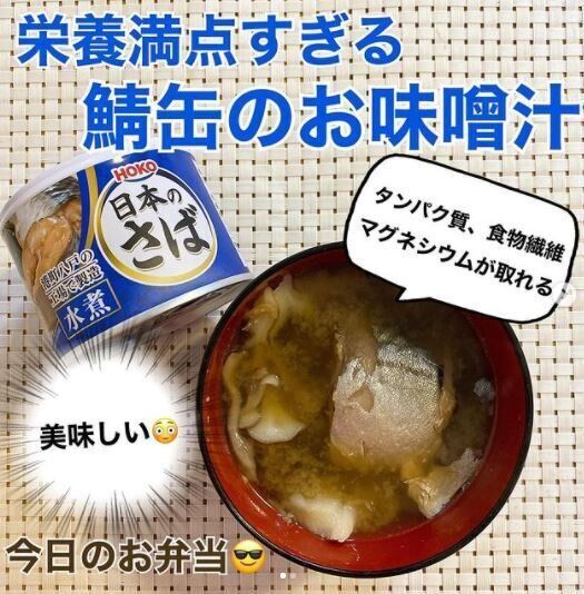 ある日のお弁当に、サバ缶を使ったみそ汁を持参しました。マイタケ・わかめ・干しエビの入っているみそ汁に、サバ缶をプラス。たんぱく質や食物繊維・ミネラルなどの栄養を、一品でバランスよくとることができます。サバ缶を活用すれば、下処理不要で手軽につくれますね。