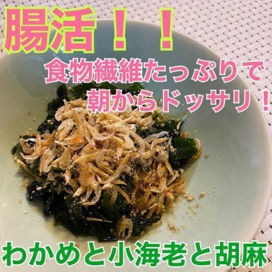 腸活のために、食物繊維とマグネシウムをとることも意識しています。こちらは、わかめ・干しエビ・ごまを組み合わせた簡単レシピ。わかめを水で戻して、干しエビ・炒りごま・少量のしょうゆ・オイルをかけてつくります。このメニューを食べると、朝からしっかりお通じがくるのだとか。