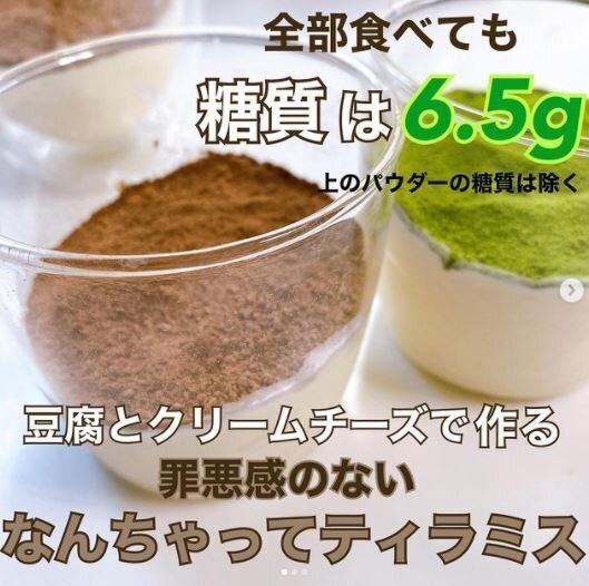 ダイエット中のおやつに、低糖質のティラミスも手作り。水切りした豆腐・常温に戻したクリームチーズ・ゼロカロリー甘味料を混ぜたら、容器に入れて冷やします。あとは、ココアパウダーや抹茶パウダーなどを振りかければ完成です。よりティラミス感をアップさせたいときは、インスタントコーヒーを加えても◎。