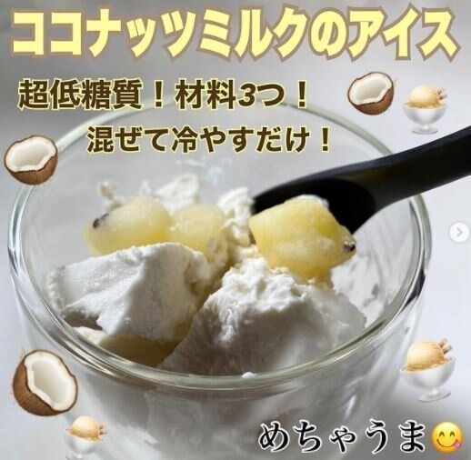 ココナッツミルクを使って、超低糖質のアイスクリームをつくりました。生クリームをホイップし、ココナッツミルク・ゼロカロリー甘味料を混ぜて冷やし固めればできあがり。3つの材料で簡単につくれて、ココナッツミルク好きにはたまらない味わいです。