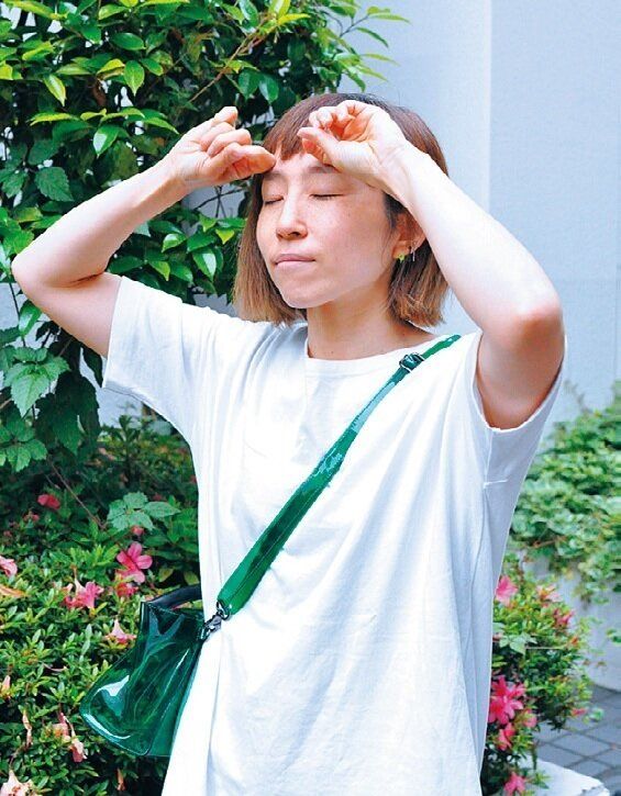 「老け見えしやすい目まわりは、意識的に指圧しています」。目の下→目尻→眉の下→こめかみをやさしく指や関節で指圧すれば、マスカラをつけなくても目が大きく見えます。