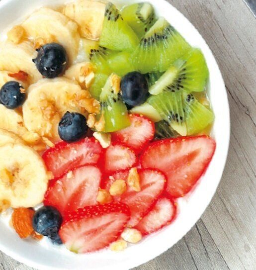 「元々フルーツが大好きなので、朝食はボウルに山盛りにしてたっぷり。くるみも必ず添えています」。ビタミンとミネラルをしっかりとることで、肌の調子もよくなったそう。