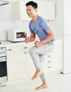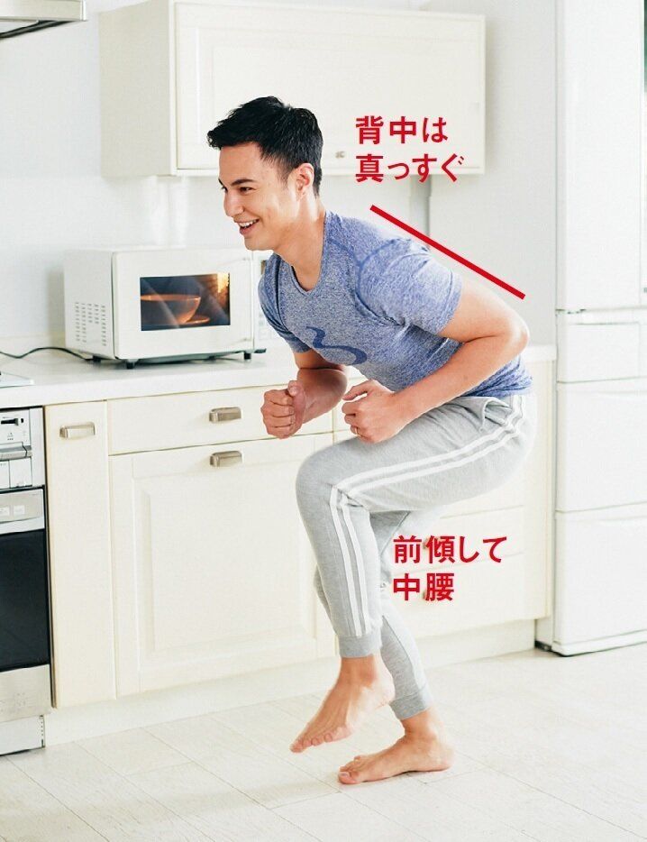 「これはきついな」というくらいに腰を落とし、上体を前に傾け、お尻を引く。電子レンジの加熱の残り時間1分くらいから、1秒につき2~3回、その場で足踏み。15秒1セットで5秒休憩。太ももの前側、お尻、ふくらはぎの筋トレに。