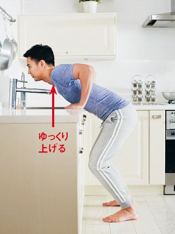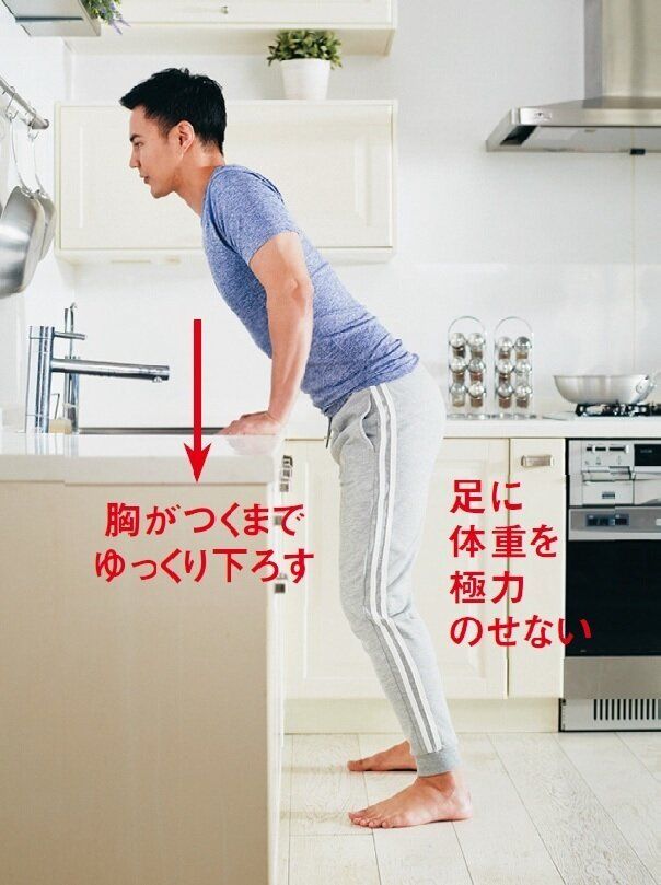 足は肩幅に開いて立ち、流し台においた手に体重をのせる。胸が流し台につくまでゆっくり下ろし、ゆっくり上げる。上腕三頭筋の筋トレに。