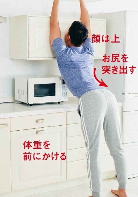 足を肩幅に開いて立ち、手を戸棚につけ、背中をゆっくり反らせる。気持ちよく伸びるところでキープ。