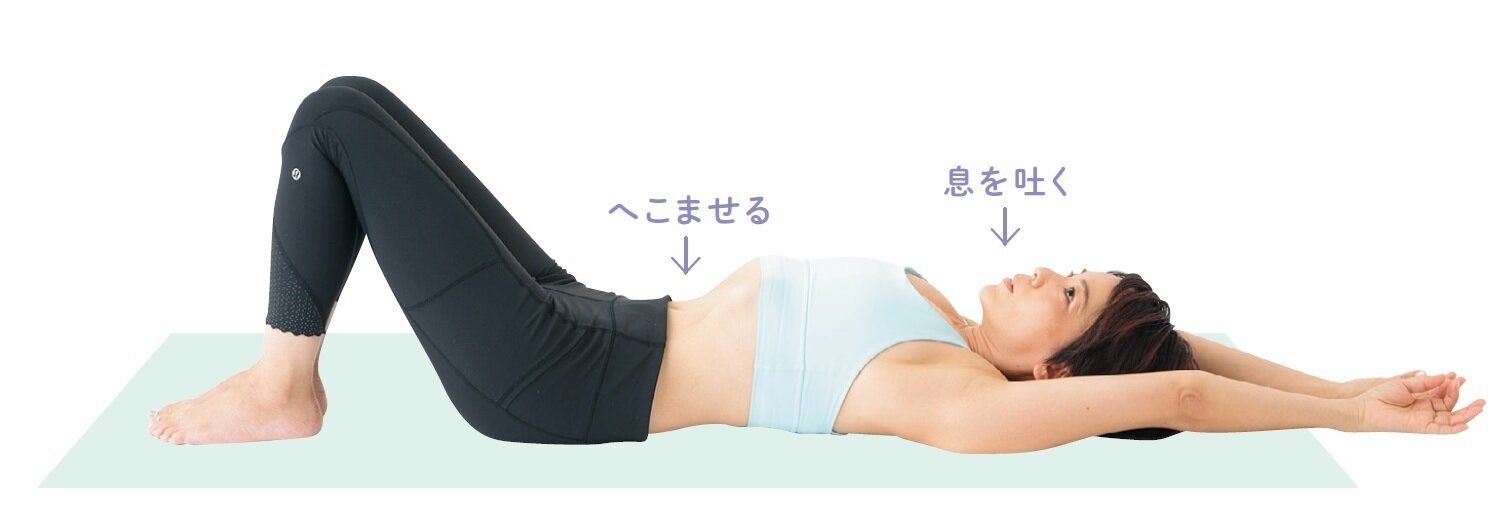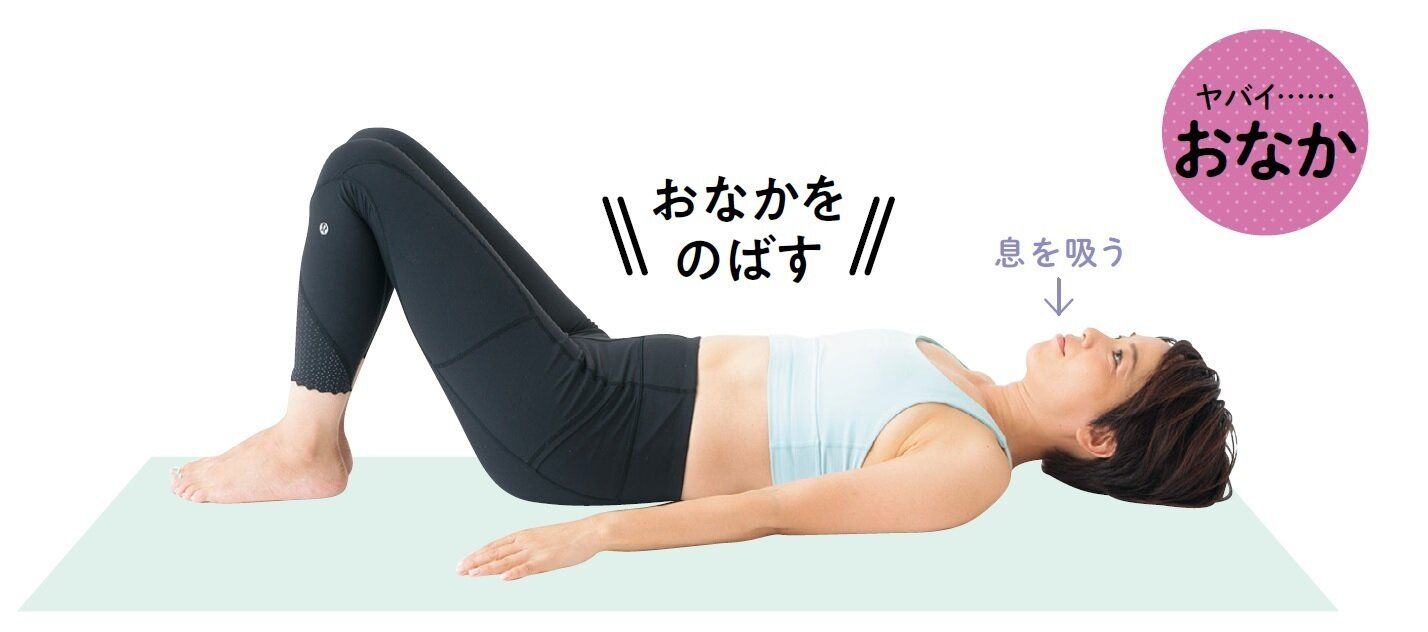 あおむけに寝て、両ひざを立て、足を軽く開く。両腕は体の横に置く。3秒で息を吸っておなかをできるだけふくらませる。