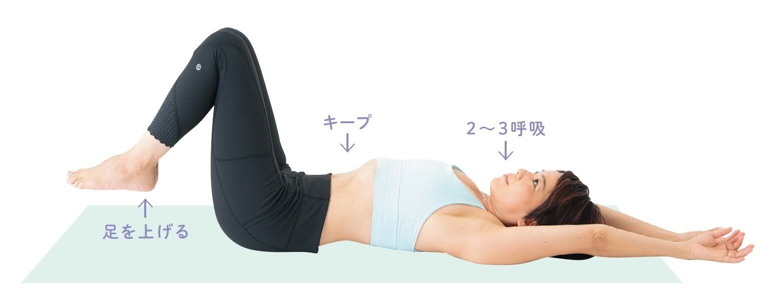 両足を床から10cm浮かせて10秒かけて2~3呼吸する。おなかの表面の筋肉を使って足を浮かせると効果なし。おなかの奥の筋肉を意識して、へこんだおなかの状態を保つのがコツ。腰を痛めないために、腰を反らせないこと。