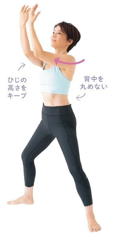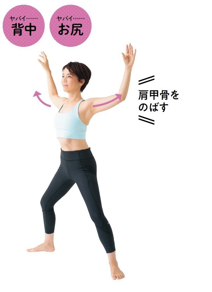 ひじを開きとじして肩甲骨のまわりをのばす。両足はしっかり開いて。背中のぜい肉やブラの上に乗る肉がスッキリし、ピーマンみたいに四角くなったお尻もプリッと上向きに。