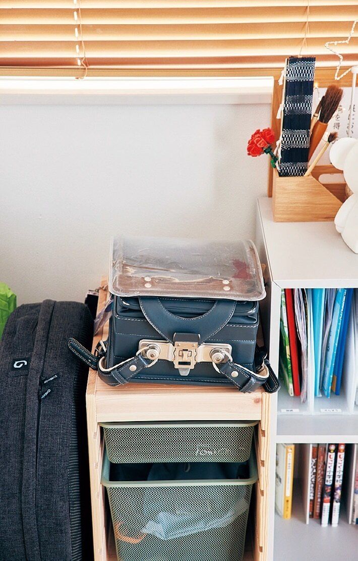 「以前は学校のロッカー風に棚の中に入れるルール。だけど長男は面倒だったみたいで定着しなくて床にポイ。棚の上に置くだけに変えたら、自然と床置きしなくなりました」。