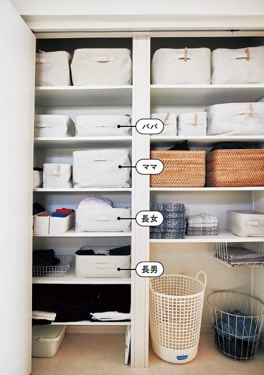 パジャマは入浴後に着るから洗面&脱衣所の棚にしまっています。「背の高い順に人別に置くと子どもも迷わず、自分で出して着てくれるから母はラク♪」。