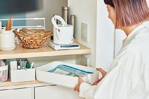 ●キッチンカウンターに散乱しがちな夫の物は「すぐ下」に専用BOXを