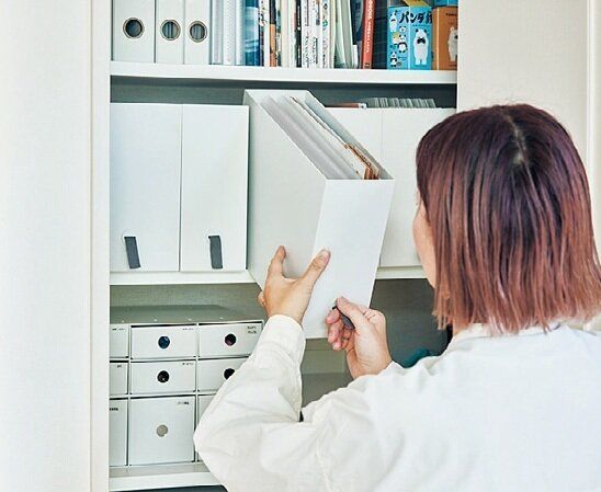 夫BOXと妻BOXにはそれぞれの契約書やお金関係の書類、子どもBOXには習い事の書類など、人別にファイルに分けると頭の中もクリアに。書類がたまって出しづらくなったら見直して、不要な書類を処分。