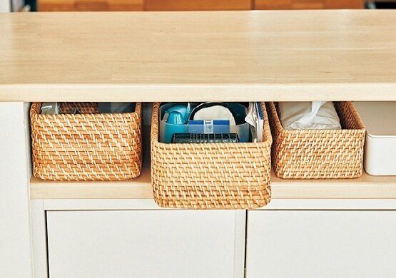 家族が日常的に使う物はキッチンカウンター脇の収納を定位置に。子どもも使う物は低めの位置に、書類など大人しか見ない物は高い位置に。「無印良品」のケースで統一してスッキリ。