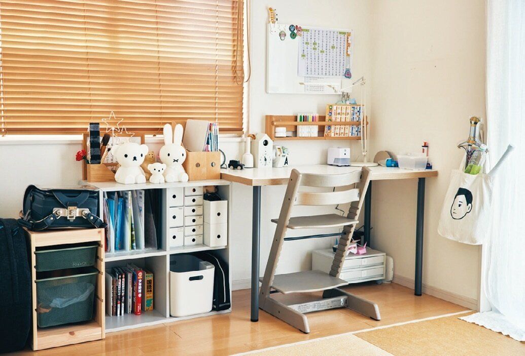 前は長女も同室だったけれど、小5の今は2階の自室に移動。長男は親が学校の準備を手伝うためリビング隣の和室に机と学用品を置いています。