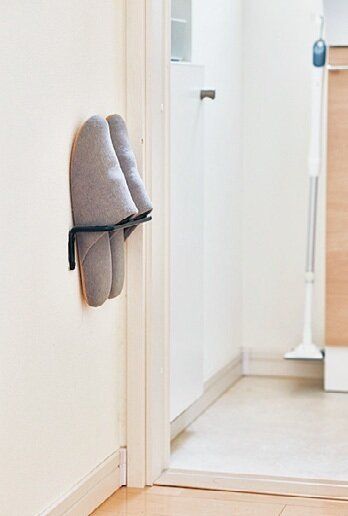 脱いだあと散乱しがちなトイレスリッパ。「フックに掛けると整って気分がいいから、私1人の時間帯はこうしています。床掃除もしやすい!」。