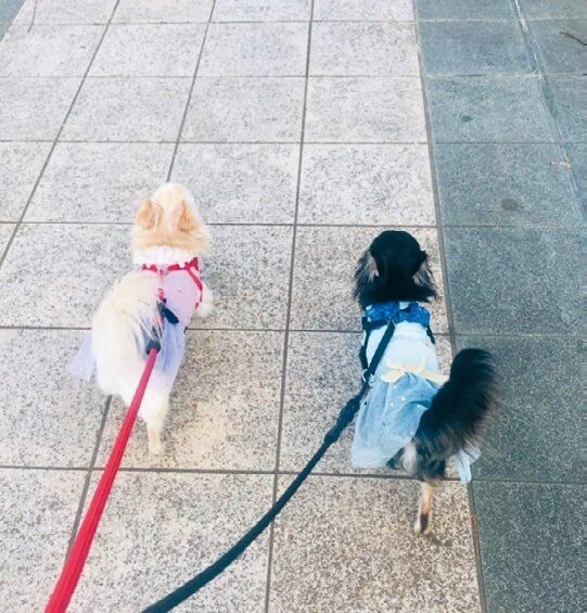 2匹のチワワ、レンちゃんとリンちゃんを連れて約1時間、早足でウォーキングをするのが朝の日課。「帰宅のころには汗だくです!」。