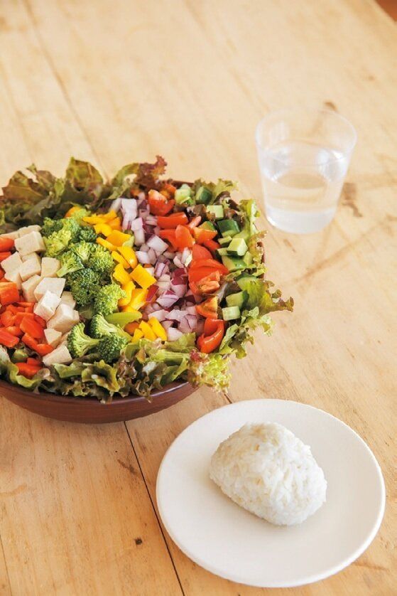 朝食は、ゆで野菜と鶏胸肉たっぷりのコブサラダをメインに、もち麦入り塩むすびをたす日も。ゆで野菜はあらかじめさいの目に切り、調理酢に漬けておけば、ピクルス風においしくいただけます。