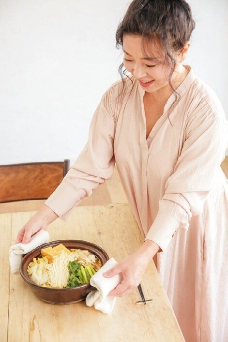 夕食は野菜、きのこ、厚揚げなど、たくさんの品目がとれる鍋が主役。味つけはポン酢と七味唐辛子と天然塩でシンプルに。お酒は低糖質のハイボールを選ぶようにしています。