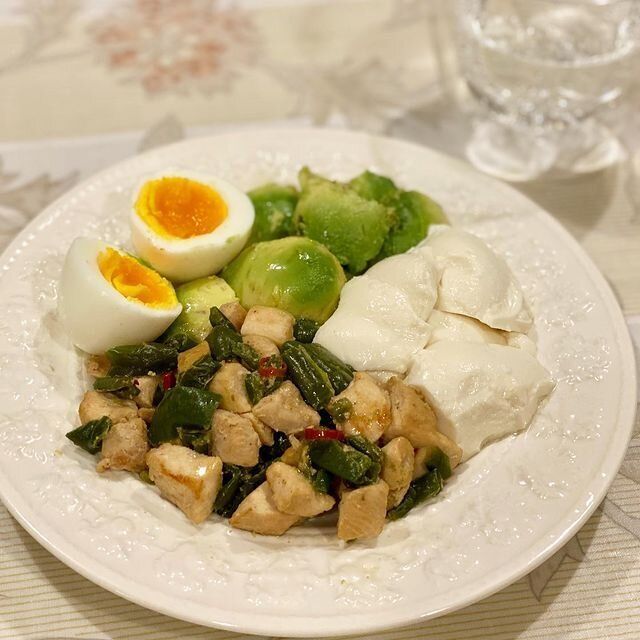 mirimoguuさんは12時から20時までの間に食事をすませるなど、メリハリのある食生活を心がけています。1日の摂取カロリー目安は1,000kcalで、水を3L飲むことも目標にしているのだとか。この日のごはんは、鶏胸肉を使ったガパオ風炒めのレシピです。ゆで卵・豆腐・アボカドを添えて、ヘルシーでバランスのいい献立にしています。