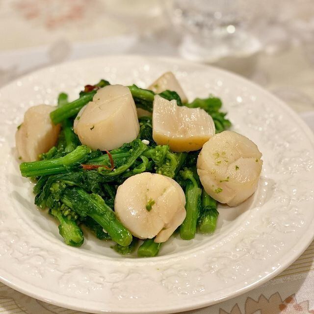 つい食べすぎてしまったときは、1週間のヘルシーウィークを設けて食事バランスを調整しています。この週の1日には、春菊とホタテをアンチョビ・ガーリック・バターで味つけした、ソテーをつくりました。ピリッとした唐辛子をプラスして、味にアクセントを加えるのがポイントです。