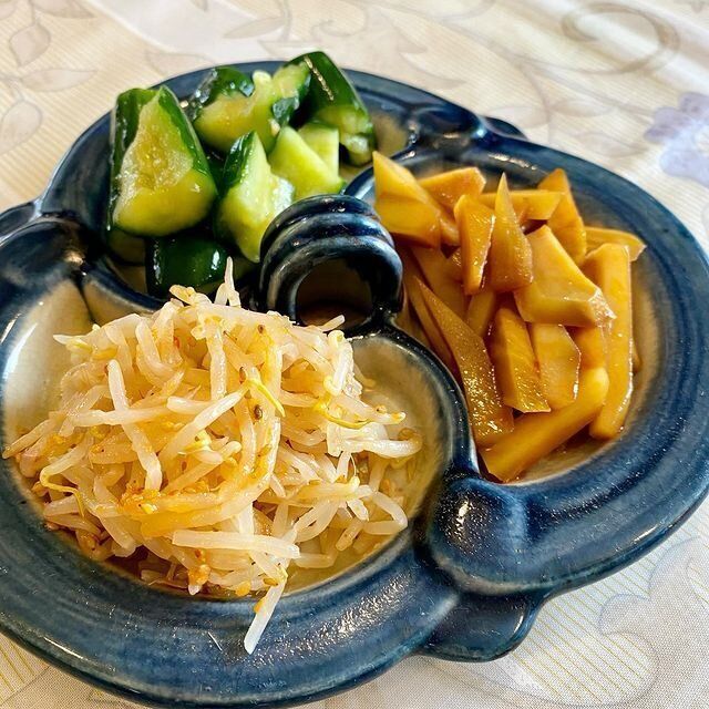 おうちでゆっくりお酒を飲みたいときには、ヘルシーなおつまみを手作りしています。1品目は、トウバンジャン・ごま油でピリ辛の味つけをした、もやしのナムル。2品目は、白だし・お酢・ゆずがきいた、きゅうりの浅漬け。3品目のザーサイは、なんとブロッコリーの芯を活用しています。