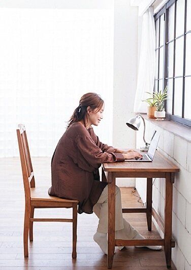 いすに深く座ります。ひざとひじが90度の状態でキーボードを打てる位置をキープ。顎を出さずに視線を少し落とすだけでパソコンの画面が見られるように。画面は見やすい角度に調節するといいでしょう。