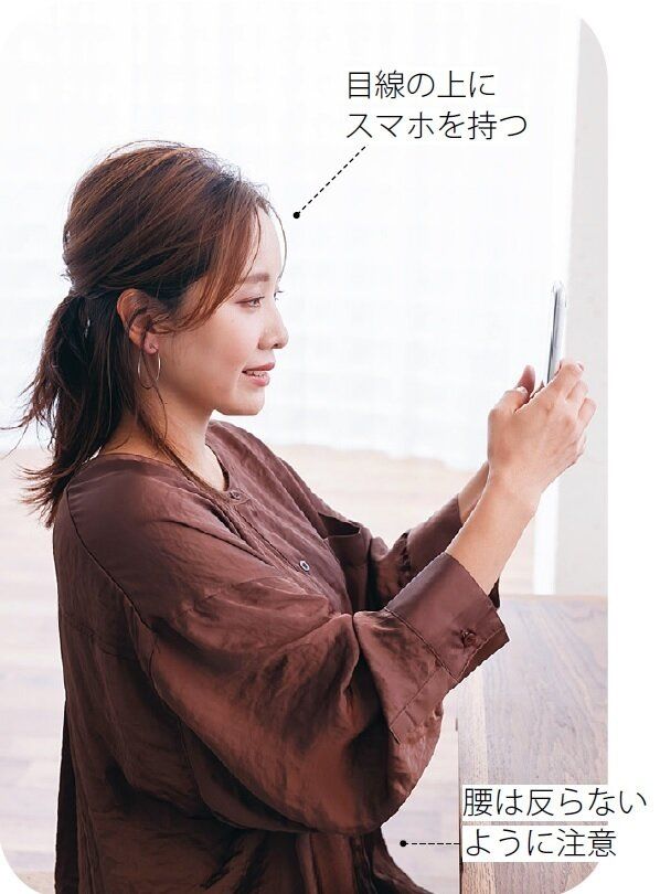 下を向いてスマホを見ていると、首の前側の皮膚が伸びてたるみの原因に。スマホの位置をグッと上げるだけで、二重顎の危険率はダウン。